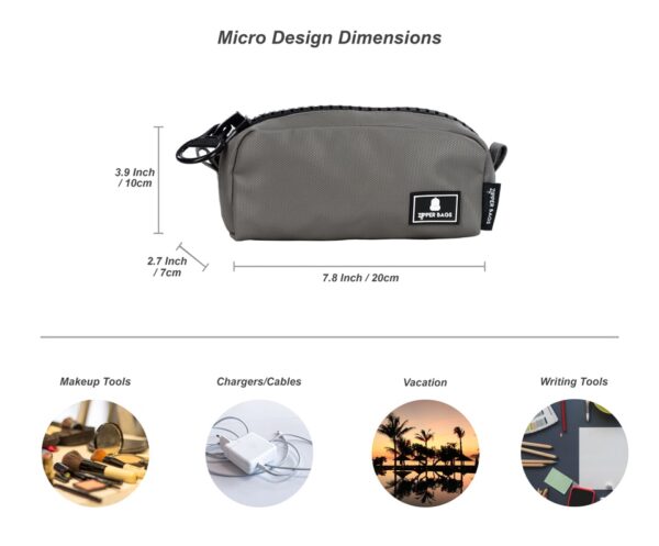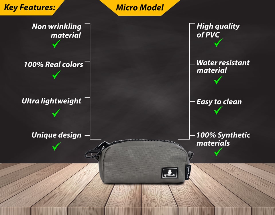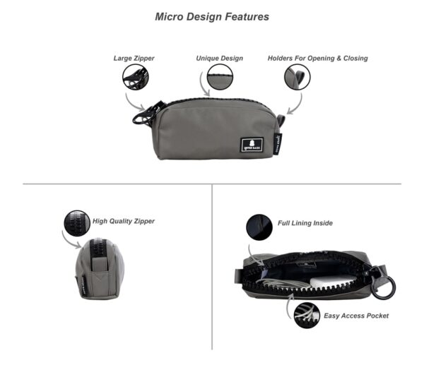 התיק מיקרו הוא התיק הקטן ביותר שיש לחברה. התיק מורכב מתא אחד מרכזי עם רוכסן גדול ומיוחד,לתיק יש בטנה מלאה והוא עשוי מחומרים עמידים במים וקלים לניקוי .