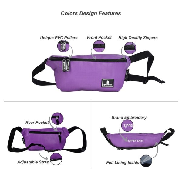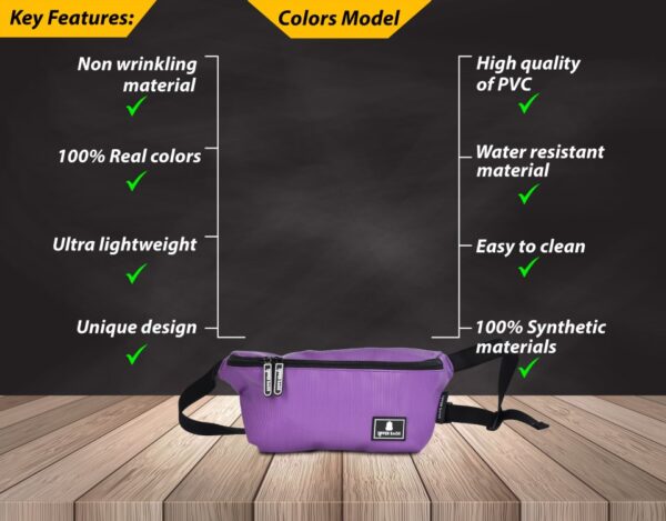 פאוץ׳ קולורס הוא הפאוץ׳ הקטן בסדרה. הוא מגיע במגוון צבעים והדפסים, כל הצבעים וההדפסים עמידים למים וקלים לניקוי. בדגם קולורס יש תא מרכזי בחלק הקידמי ועוד כיס אחורי מוגן שמתאים לאחסון של כסף, מסמכים או ארנק, כל הכיסים מגיעים עם בטנה איכותית. דגם קולורס מעוצב באופן מדויק לפי הגודל האידאלי לשימוש יומיומי נוח וקל עם רצועה מתכווננת לפי גודל הגוף ומתאים לשימוש על המותן או על החזה.