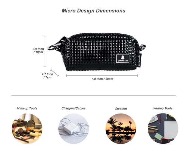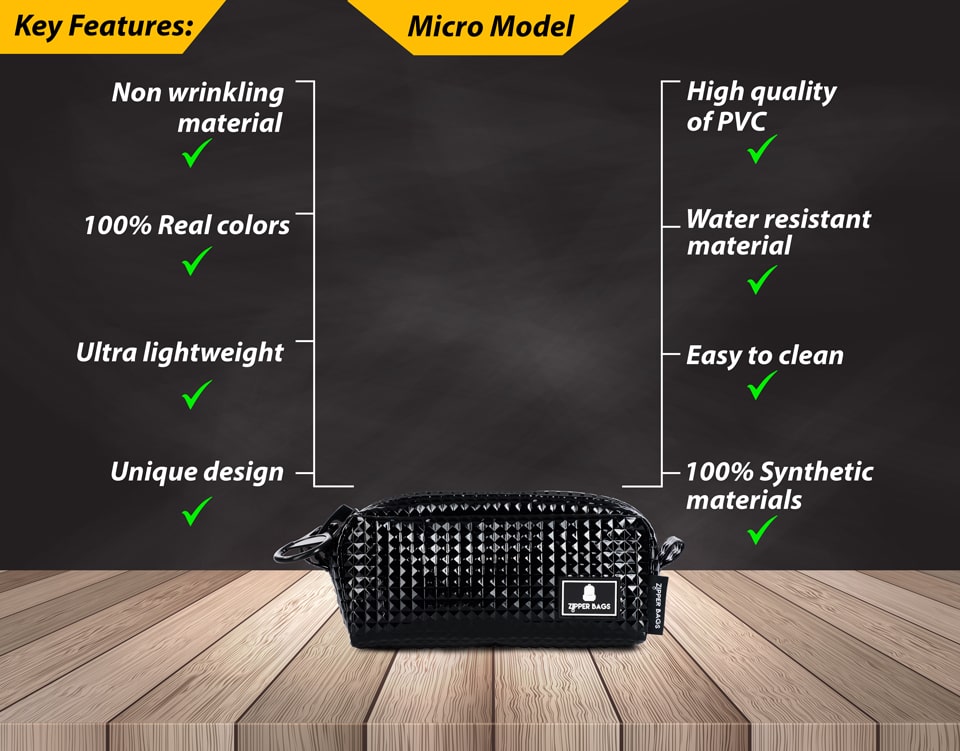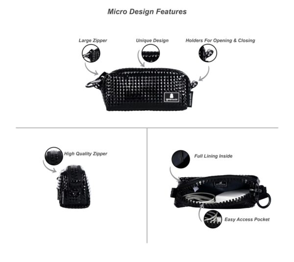 התיק מיקרו הוא התיק הקטן ביותר שיש לחברה. התיק מורכב מתא אחד מרכזי עם רוכסן גדול ומיוחד,לתיק יש בטנה מלאה והוא עשוי מחומרים עמידים במים וקלים לניקוי .