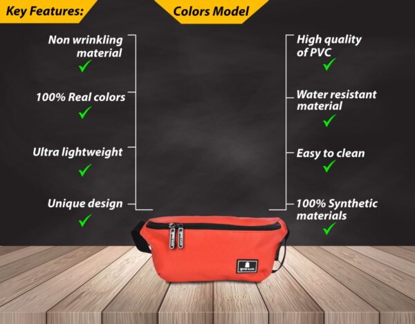 פאוץ׳ קולורס הוא הפאוץ׳ הקטן בסדרה. הוא מגיע במגוון צבעים והדפסים, כל הצבעים וההדפסים עמידים למים וקלים לניקוי. בדגם קולורס יש תא מרכזי בחלק הקידמי ועוד כיס אחורי מוגן שמתאים לאחסון של כסף, מסמכים או ארנק, כל הכיסים מגיעים עם בטנה איכותית. דגם קולורס מעוצב באופן מדויק לפי הגודל האידאלי לשימוש יומיומי נוח וקל עם רצועה מתכווננת לפי גודל הגוף ומתאים לשימוש על המותן או על החזה.